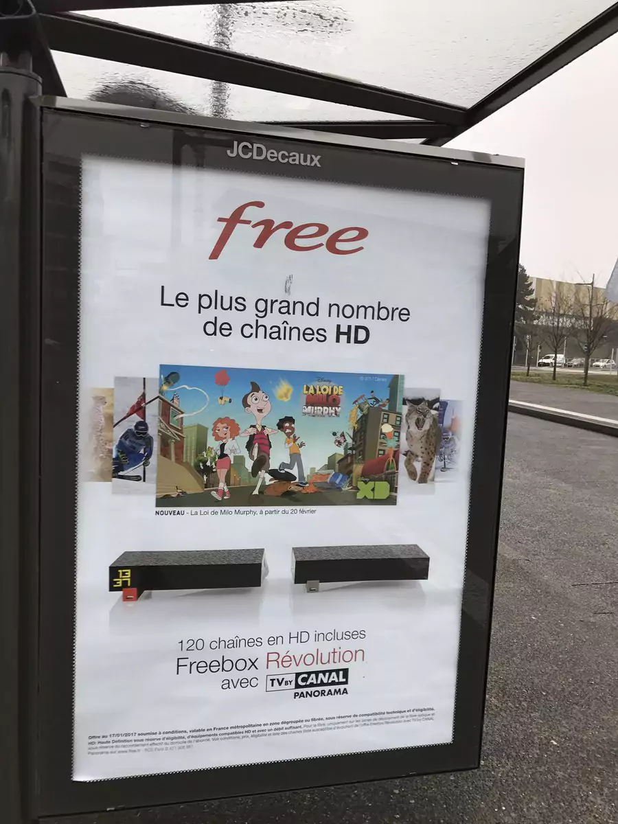 Free a lancé il y a quelques jours une nouvelle campagne d’affichage sur le mobilier urbain dans laquelle il communique autour de son service de télévision. Nous vous présentions hier l’affiche qui mettait en avant la chaîne MTV, incluse avec la Freebox Révolution. Aujourd’hui, Max, sur Twitter, nous envoie la photo d’une nouvelle affiche, prise à Metz, qui met en avant la première place de Free en termes de chaînes HD. Il en compte plus de 190, presque le double de ses concurrents, dont 120 incluses pour les abonnés Freebox Révolution et TV by Canal