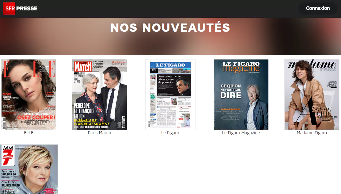 Ainsi ce sont Le Figaro, La Voix du Nord, Elle, Paris Match et Télé 7 Jours qui s’ajoutent à la liste des 60 titres qui sont déjà disponibles. Comme l’indique Marc Feuillée, directeur général du groupe Figaro, "notre objectif est de tester cette nouvelle forme de distribution de la presse qui combine la puissance du parc d’abonnés de SFR et la proposition de valeur des contenus presse".