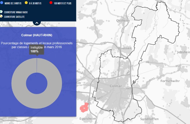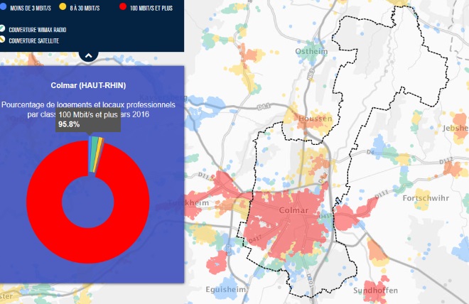 Grâce à la première carte on peut voir que la ville de Colmar est couverte à 95,8% par le très haut débit.