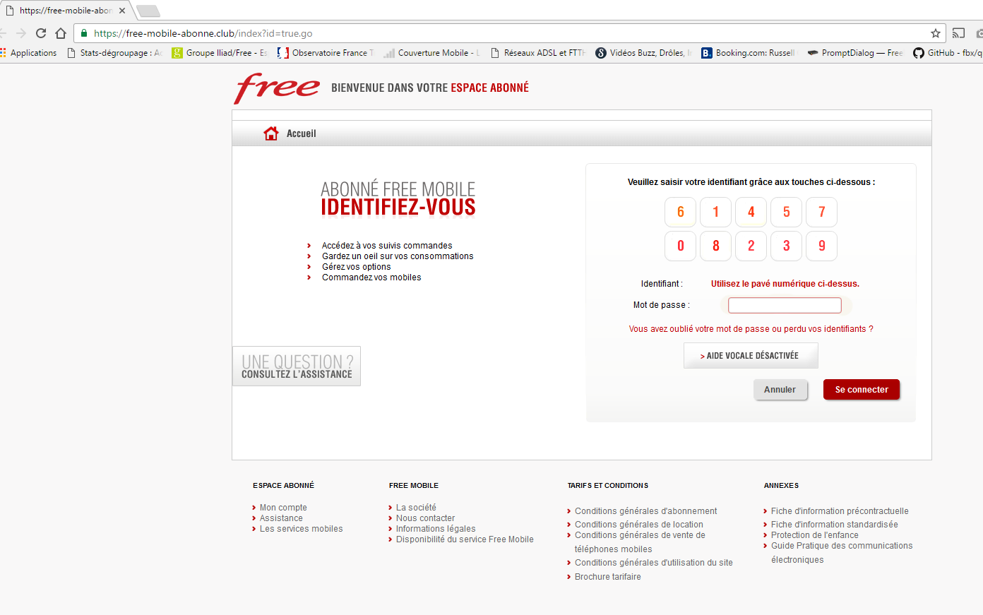 La copie est presque parfaite. Lorsque les abonnés Free mobile souhaitent se connecter sur leur espace client via google en tapant par exemple : « Free mobile espace client », une adresse sans équivoque s’affiche alors dans le moteur de recherche : free-mobile-abonne.club . A première vue, rien de suspicieux ni d’anormal, la page d’accueil ressemble comme deux goûtes d’eau à la page officielle de l’espace abonné Free Mobile, même visuel, même pavé numérique. Seulement, l’URL est totalement fausse.