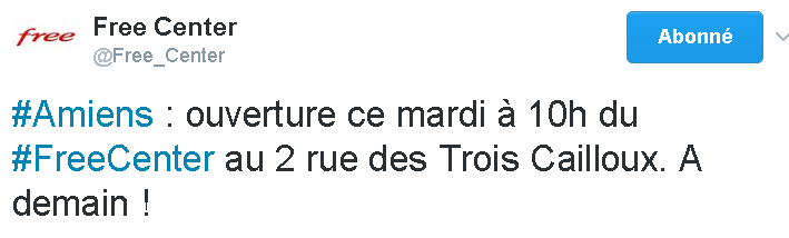 Ca y est, après de nombreux mois d’attente, le Free center d’Amiens va ouvrir ses portes. Free annonce en effet sur Twitter que cette nouvelle boutique de la préfecture du département de la Somme ouvrira demain, à 10h, rue des 3 cailloux.