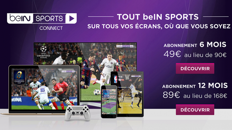 BeIN Sports vient de lancer une offre promotionnelle sur le site Showroom Privé. Celle-ci propose 6 mois d’abonnement à beIN Sports Connect à 49€ au lieu de 90€, ou 12 mois d’abonnement à 89€ au lieu de 168€.