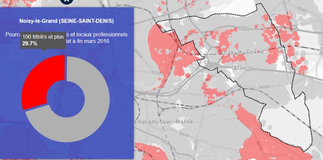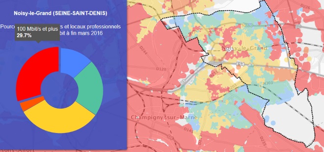 Grâce à la première carte on peut voir que la ville de Noisy-le-Grand est couverte à 29,7% par le très haut débit.