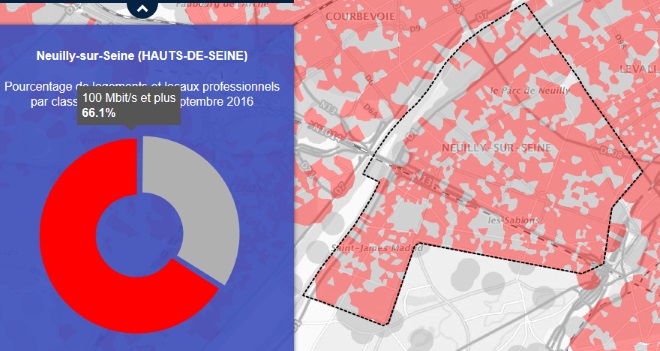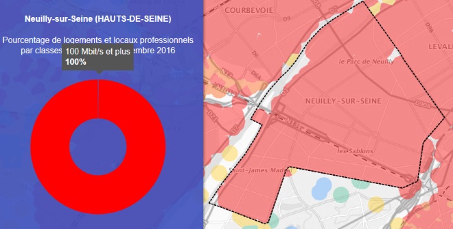 Grâce à la première carte on peut voir que la ville de Neuilly-sur-Seine est couverte à 100% par le très haut débit.