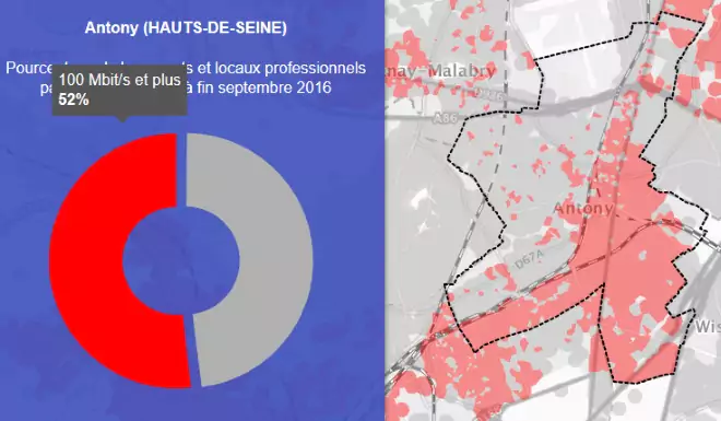 Grâce à la première carte on peut voir que la ville de Antony est couverte à 99,6 % par le très haut débit.