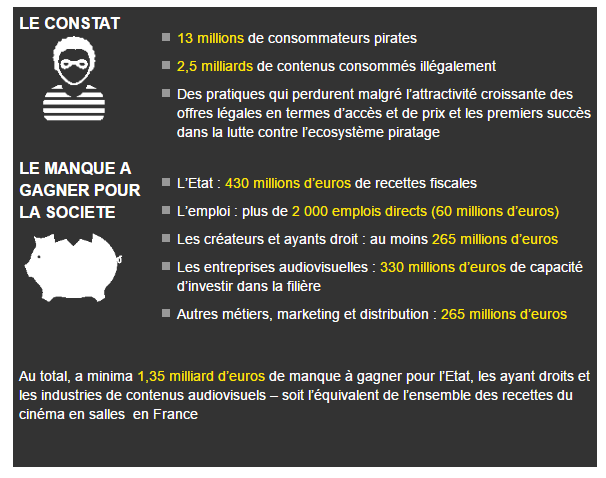 Selon une étude du cabinet EY, 13 millions d’internautes français se sont encore adonnés en 2016 au piratage, au total 2.5 milliards de contenus audiovisuels ont été consommés illégalement. Un manque à gagner global de 1.35 milliard d’euros.