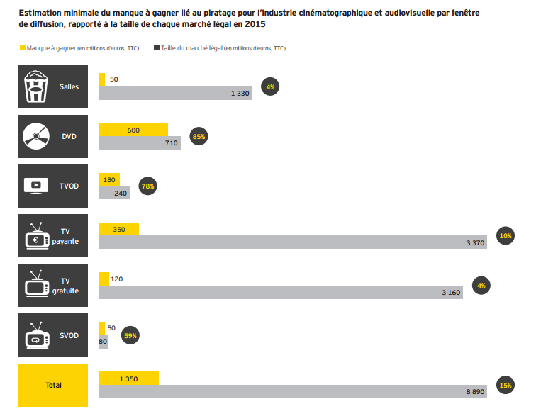 Les secteurs les plus touchés sont les DVD, la VOD et la TV payante qui a perdu « des abonnés potentiels à hauteur de 350 millions d’euros". Un diffuseur de TV payante estime d’ailleurs que « le piratage est un fléau, l’endiguer nécessite des efforts constants et coûteux. Les pirates font évoluer les méthodes de piratage… Historiquement limité à la voie satellite, le piratage de nos flux live est désormais en train de se développer sur le canal IP, avec des forfaits à prix cassés proposés par les sites pirates ».