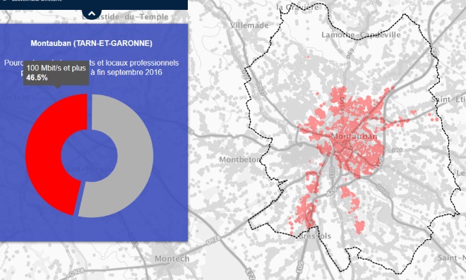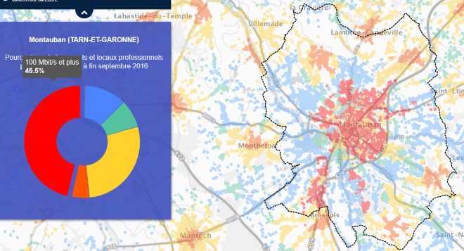 Grâce à la première carte on peut voir que la ville de Montauban est couverte à 46,5% par le très haut débit.