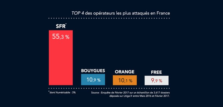 Rien ne va plus chez SFR à en croire le site litige.fr qui dans son étude de février 2017, dévoile que sur un échantillon de 3617 dossiers concernant les litiges contre les opérateurs télécom TV/ internet, à lui seul, SFR fait l’objet de plus de signalements que ses trois autres concurrents réunis avec 55,3%, soit un litige sur deux. Bouygues Télécom suit avec 10,9 %, Orange n’est pas loin avec 10,1% alors que Free apparaît comme étant le moins attaqué entre mars 2016 et février 2017, avec 9,9%. A noter que ce classement ne comptabilise que le nombre de plaignants sur le site et ne dresse pas de constat en fonction du nombre total de clients par opérateur.