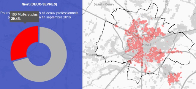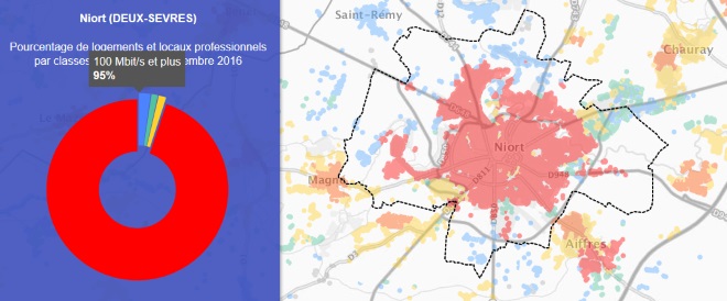 Grâce à la première carte on peut voir que la ville de Niort est couverte à 95% par le très haut débit.