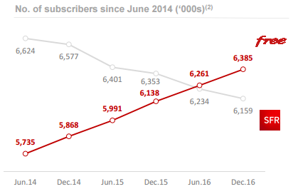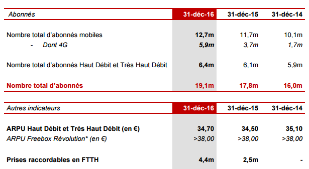 C’est la première qu’était pris en compte sur un trimestre entier l’impact de l’intégration de TV by Canal dans l’offre Freebox Révolution. Free a en effet lancé fin septembre la nouvelle offre Freebox Révolution avec TV by CANAL Panorama et le service myCANAL inclus, ajoutant ainsi 50 chaînes (dont 25 exclusives) aux 226 chaînes déjà incluses dans l’offre Freebox TV, pour un montant de 39,99 euros/mois. L’ARPU bénéficie de l’impact positif cette nouvelle offre, et s’établit à 34,70 euros au 31 décembre 2016.