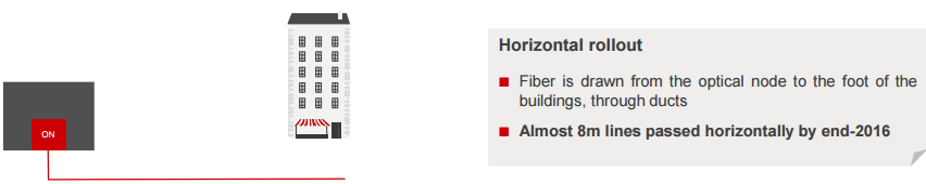 A fin 2016, 8 millions de lignes sont concernées par le déploiement horizontal, c’est-à-dire que la fibre est tirée du NRO jusqu’au pied du Bâtiments