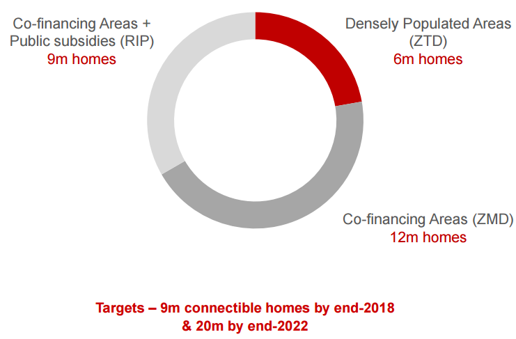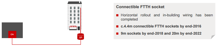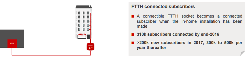 Concernant les prises FTTH connectables, pour lesquelles le déploiement horizontal et le câblage dans l’immeuble ont été terminé, elles sont au nombre de 4,4 millions à fin 2016 avec une prévision de 9 millions en 2018 et 20 millions en 2022