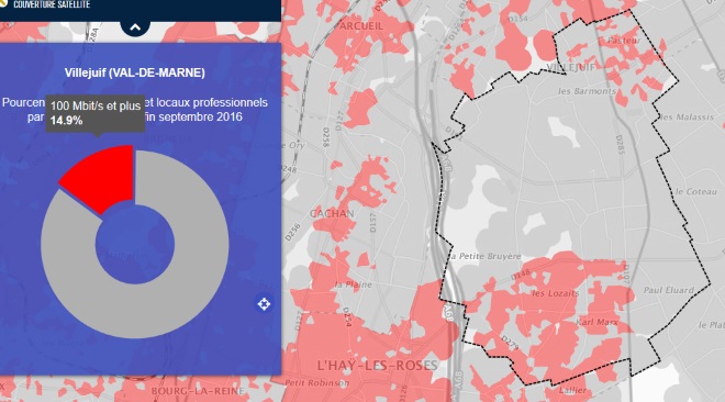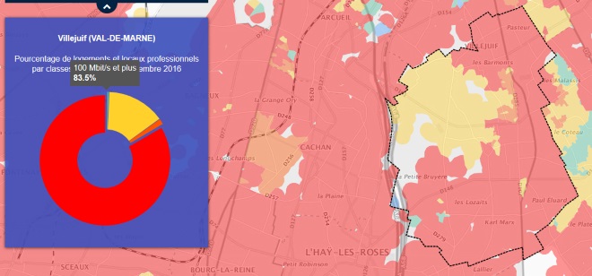 Grâce à la première carte on peut voir que la ville de Villejuif est couverte à 83,5% par le très haut débit.