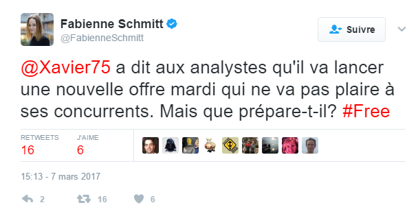 Ce matin avait lieu la présentation des résultats d’Iliad pour l’année 2016 devant les analystes financiers. Une conférence à laquelle participait Xavier Niel. Et on peut dire que le fondateur de Free a un don pour lancer les buzz. En effet, selon Fabienne Schmitt, Chef adjointe du service High Tech Médias des Echos, Xavier a dit aux analystes qu’il va lancer une nouvelle offre mardi qui ne va pas plaire à ses concurrents. Il s’agit bien sûr de mardi prochain donc le 14 mars.