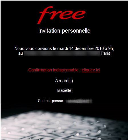 Mais au delà, Free n’annonce jamais à l’avance quand il organise une keynote pour présenter ses nouveautés. Les journalistes sont prévenus 1 ou 2 jours à l’avance, au travers d’une invitation qui leur est envoyée par mail. Vous pouvez retrouver les invitations pour les présentations des deux dernières Freebox (Révolution et Mini 4K) ci-dessous :