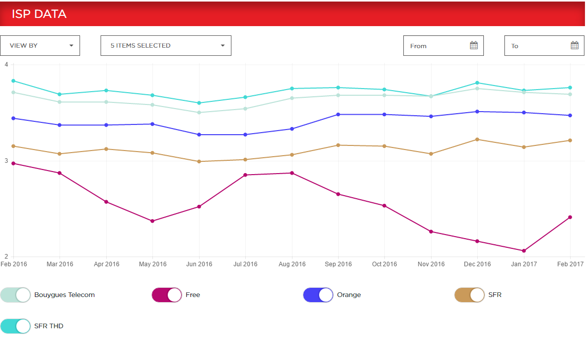 Comme chaque mois, Netflix publie son ISP Speed Index, qui mesure la vitesse moyenne de ses flux selon les pays et les opérateurs. Durant le mois de fevrier les choses ont peu évolué en France sauf pour Free. SFR "câble" reste en 1ère position avec un débit moyen de 3,76 Mbits/s, suivi de Bouygues Télécom, Orange et SFR. Le changement le plus visible concerne Free qui remonte enfin après plusieurs mois de chute. L’opérateur passe de de 2,06Mbits/s à 2,41Mbits/s. Il reste toutefois en dernière position.