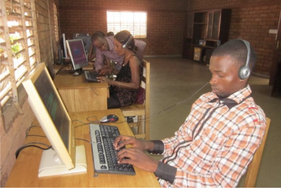 Un jeune guinéen non-voyant en train de tester des ordinateurs fraîchement installés par l’association AHCE