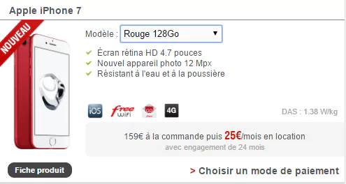 L’iPhone 7 RED est disponible au tarif de 859€ en 128Go et 979€ en 256Go. Il est possible également de payer ce smartphone en 4 fois sans frais ou en 24 mensualités sans frais.