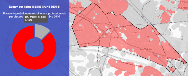 Grâce à la première carte on peut voir que la ville de Epinay-sur-Seine est couverte à 94.5% par le très haut débit.
