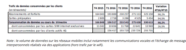 La principale raison invoquée par le régulateur est « l’extension de la couverture du territoire par les réseaux 4G et l’accroissement de l’équipement de la population en terminaux adaptés », participant donc à la croissance des usages. Ainsi fin décembre, le nombre d’utilisateurs des réseaux 4G s’élève à 31,9 millions, soit une augmentation de 9,8 millions sur un an et 44% des cartes SIM (+ 13points). En ce qui concerne les réseaux 3G, ils ont été utilisés par plus de sept cartes SIM sur dix, (+ 4,2 millions d’utilisateurs). « Le volume de données échangées sur les réseaux mobiles double en un an avec 330 000 téraoctets sur le trimestre, croissance attribuable aux clients actifs en 4G qui réalisent 89% de ce volume. La consommation moyenne de données, qui augmente en conséquence, atteint 1,6 gigaoctet par mois et par carte et jusqu’à 2,4 gigaoctets pour les clients se connectant à l’internet mobile », annonce enfin l’Arcep.