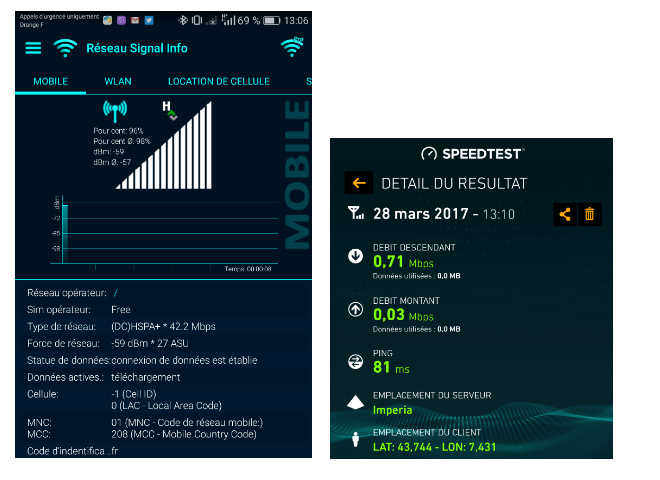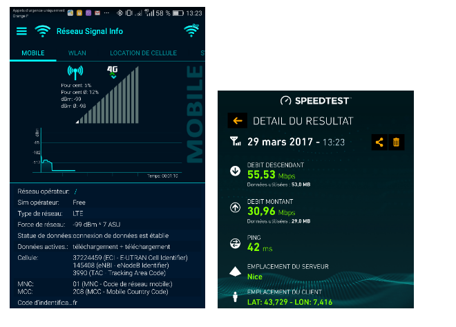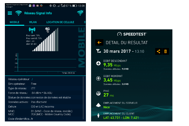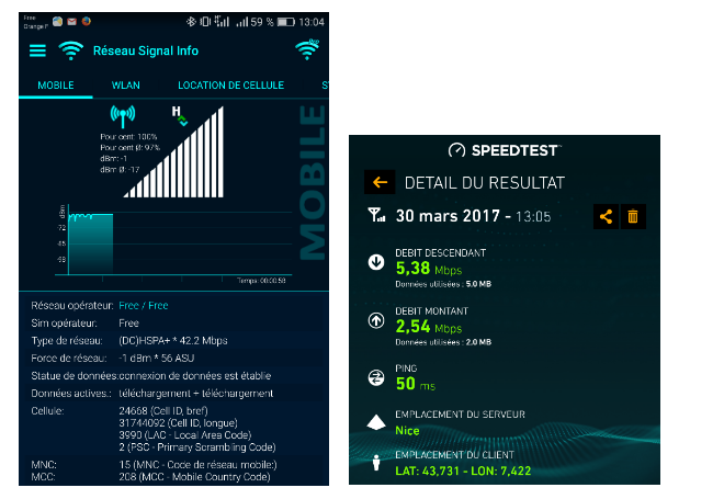Voici quelques tests de débit effectués par Frédéric sur le réseau Free Mobile et Orange dans différents lieux de la Principauté.