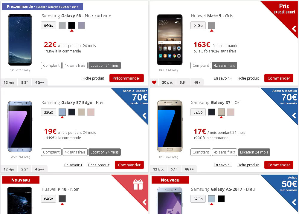 Sur chaque présentation de téléphone, on peut désormais directement visualiser les couleurs disponibles. On peut également voir, dès la page d’accueil, les différentes propositions d’achats, ou de location, alors qu’il fallait auparavant cliquer sur la fiche produit.