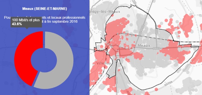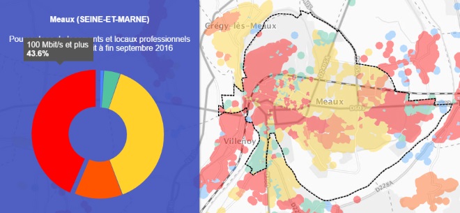 Grâce à la première carte on peut voir que la ville de Meaux est couverte à 43.6% par le très haut débit.