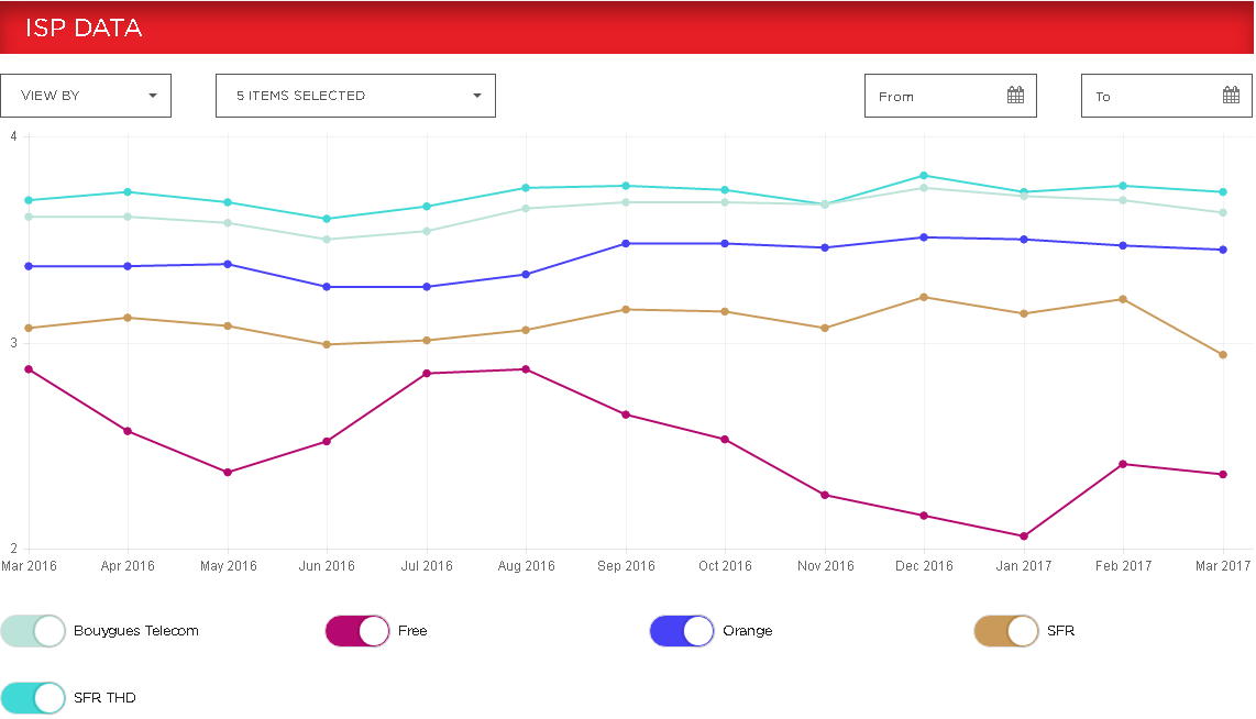 Comme chaque mois, Netflix publie son ISP Speed Index, qui mesure la vitesse moyenne de ses flux selon les pays et les opérateurs. Pour le mois de mars 2017, tous les opérateurs sont en sont en légère baisse. SFR baisse plus que les autres et tombe à 2,94 Mbits/, mais Free reste dernier avec une débit moyen sur Netflix de 2,36Mbits/s. Les positions des autres opérateurs ne bougent pas : SFR THD (sur le réseau cable) reste en première position avec un débit moyen de 3,73 Mbps, et Bouygues Telecom en deuxième place avec 3,63Mbits.