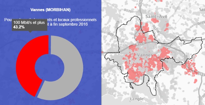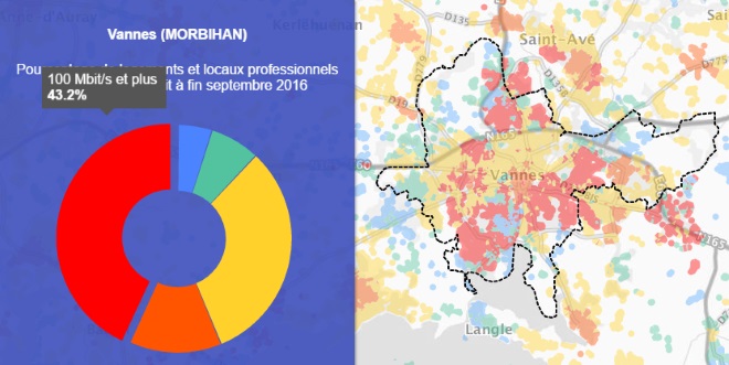 Grâce à la première carte on peut voir que la ville de Vannes est couverte à 43.2% par le très haut débit.
