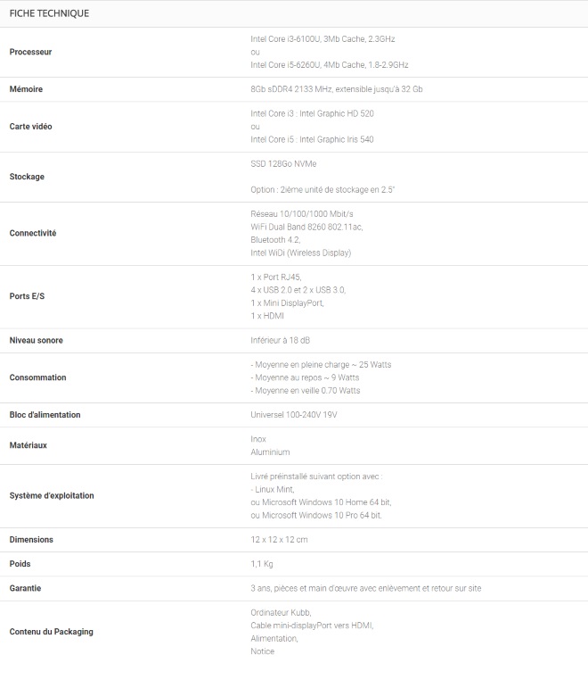 Cette édition limitée du Kubb est composé d’inox et d’aluminium. Il est équipé de processeurs Intel i3-6100U ou i5-6260U ainsi que 8 Go de RAM extensible jusqu’à 32 Go. Il sera aussi doté d’un SSD M.2 NVMe 128 Go afin de maximiser les performances de la machine. Diverses connectiques sont disponibles sur la face arrière du PC(USB 2.0, USB 3.0, HDMI…). Différents systèmes d’exploitation peuvent être livrés avec le Kubb Nébuleuse : Windows 10 Pro, Windows 10 Home et enfin Linux Mint.