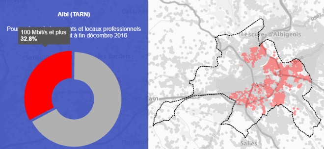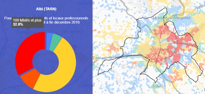 Grâce à la première carte on peut voir que la ville de Albi est couverte à 32.8% par le très haut débit.