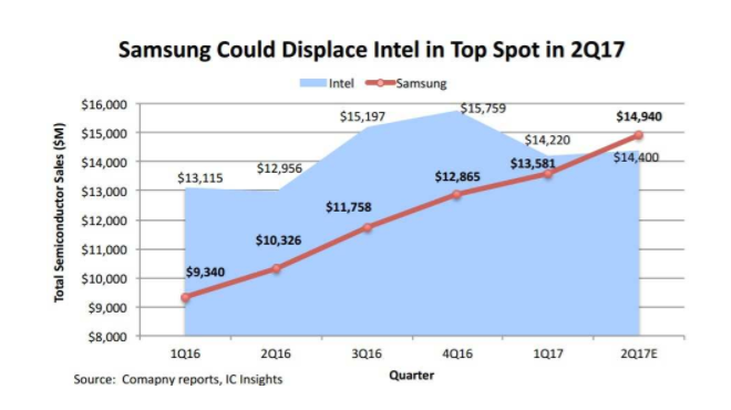 Selon IC Insights, Samsung serait sur le point de vendre plus de puces et micro processeurs au cours du 2ème trimestre 2017 que son concurrent Intel. La marque américaine était jusqu’à présent la première mondiale dans ce domaine depuis 1993.