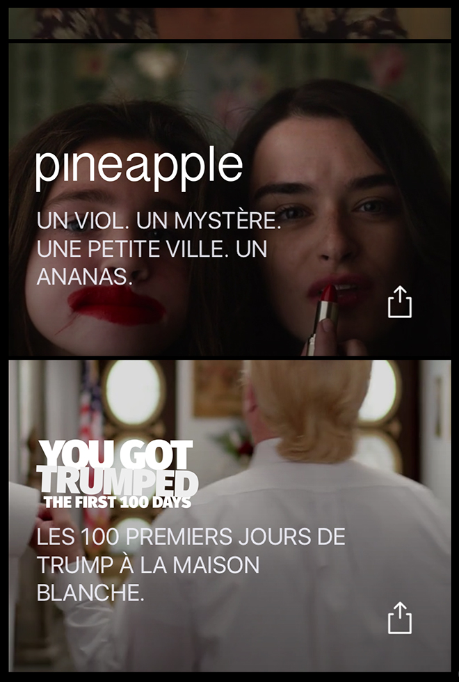 Initialement 10 séries « brutes » et « addictives » étaient prévues au lancement, finalement ce sera 9, « Playground » de Luc Besson ou comment apprendre à tuer à l’école, « Junior » de Zoe Cassavetes racontant la vie délurée d’une adolescente à Los Angeles, « Skinford », « Duels », « Tycoon » de Louis Leterrier, « Pillow Talk » avec Patrick J.Adams, « All Wrong » avec Brittany Furlan, « Pine Apple » et enfin « You Got Trumped », résumant avec humour les 100 premiers jours de Trump à la Maison Blanche. Autant de séries adressées à un public jeune puisque la cible est les 15-35 ans. A noter que pour certaines séries, la saison 1 est disponible intégralement, en revanche pour d’autres seulement quelques épisodes sont disponibles pour le moment. La suite se fera au compte-gouttes.