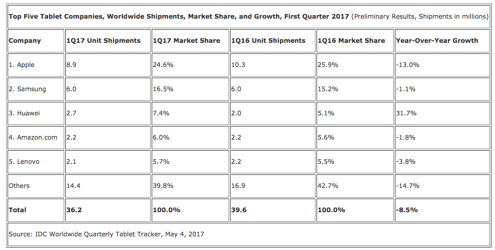 Si Apple conserve son leadership avec 24,6% de part de marché, ses ventes d’iPad sont à la baisse (-13%), les résultats d’Apple montrent ainsi qu’il n’est pas à l’abri de la dynamique changeante de l’industrie et de la demande des consommateurs. Néanmoins, le cabinet note que 2016 était la première année complète en matière de ventes d’iPad Pro pour Apple, qui comprenait le lancement de la version 9,7 pouces dont l’écran est plus petit. Cette gamme de produits a d’ailleurs rapidement propulsé Apple au sommet du marché des tablettes détachables et IDC croit que la marque à la pomme est en mesure de rester compétitive sur ce segment malgré l’utilisation d’un «système d’exploitation mobile» alors que de nombreux concurrents entrent sur le marché avec des périphériques évoluant sous Windows.
