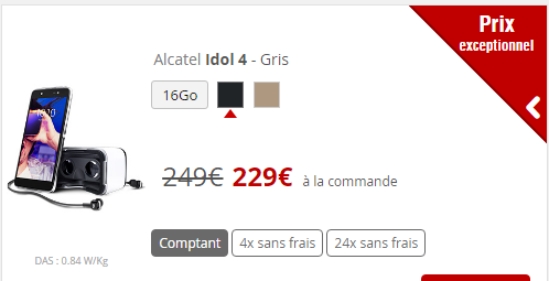 Free Mobile propose une baisse de tarif temporaire sur Alcatel Idol 4. Du 4 au 18 Mai, il est proposé à 229€ au lieu de 249€ en paiement comptant. Il est aussi disponible en 4 fois sans frais : 58€ puis 57€ durant 3 mois ou 24 mensualités : 37€ puis 8€ durant 24 mois