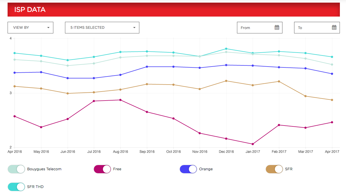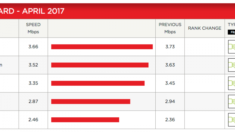 Pour le mois d’avril 2017, SFR THD (sur le réseau câble) garde la tête malgré une légère perte de vitesse comme la plupart de ses concurrents avec 3,66 Mbits/s contre 3,73 Mbits/s le mois dernier. Bouygues Telecom conserve sa seconde place avec 3,52 Mbits/s contre 3,63 Mbits/s en mars. Même constat pour Orange à la troisième place, avec un débit moyen de 3.35 Mbits/s mesuré (3.45 Mbits/s en mars). SFR passe quant à lui de 2.94 Mbits/s à 2.87 Mbits/s au mois d’avril alors que Free enclenche enfin une légère remontée mais reste dernier de la classe avec 2.46 Mbits/s contre 2.36Mbits/s le mois dernier.