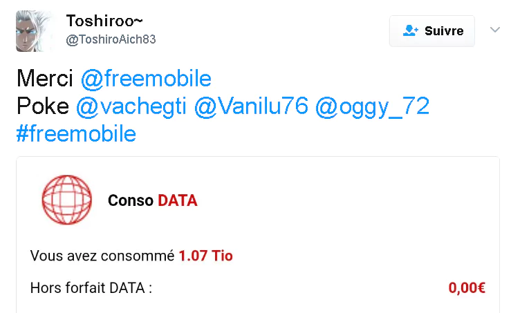 C’est ainsi que Toshiroo, un abonné Free Mobile, a publie sur Twitter sa consommation data pour le mois dernier qui atteint 1,07 To ! Un record. Il prouve en tous cas que les usages s’adaptent à l’enveloppe data qui est proposée dans son forfait mobile et que plus les opérateurs l’améliore, plus la consommation augmente.