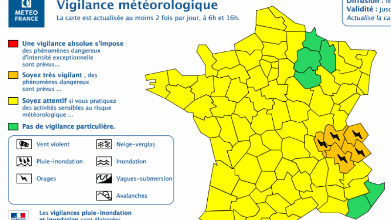 Même si nous sommes fous d’elles, il est préférable d’éviter tout coup de foudre avec les Freebox. Si vous êtes dans le Rhône, l’Ain, l’Isère, la Savoie et la Haute-Savoie pensez à mettre vos Freebox à l’abri des intempéries. Ces cinq départements ont été placés en alerte orange en raison des violents orages prévus, selon la carte de vigilance de Météo-France. L’alerte a été diffusée ce matin à 6h00 (elle est valable jusqu’à vendredi matin 6h00) :