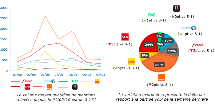Netino (Webhelp) et Synthesio viennent de publier leur étude hebdomadaire sur la perception sociale des principaux opérateurs télécoms sur le marché français pour la semaine du 1er au 7 mai 2017. Cette étude se base sur la collecte automatique des données sur un corpus de plus de 600 000 000 sites, blogs, forums, profils Facebook et Twitter.