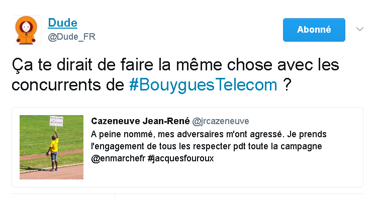 Et comme un retour de boomerang, ce même Jean René Cazeneuve se plaint maintenant d’avoir été « agressé » par ses adversaire (politiques cette fois). Et de préciser « Je prends l’engagement de tous les respecter pendant toute la campagne ». Un tweet auquel il s’est vu répondre « Ça te dirait de faire la même chose avec les concurrents de #BouyguesTelecom ? »