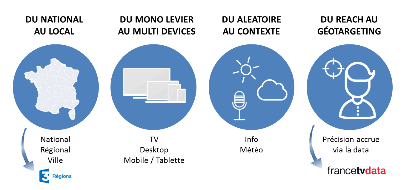 Alors que SFR va tester la publicité ciblée cet été sur sa chaîne BFM Paris et que TF1 a mené des expérimentations sur la publicité ciblée et géolocalisée, FranceTV Publicité lance une offre multi-services de télévision géolocalisée avec la capacité de cibler 24 zones géographiques en France, ce qui correspond à l’organisation de France 3 dans l’hexagone. Le but de ce ciblage spécifique est d’avoir des communications sur-mesure mais surtout de permettre aux annonceurs d’optimiser la pertinence de leurs campagnes publicitaires, « en renforçant leur message national par un complément d’information locale ou régionale (coordonnées d’une concession ou d’un point de vente par exemple, …) ou encore en adaptant leur création à la cible visée. » Au delà de sa capacité de géolocalisation des spots TV, France télévisions inclut désormais le digital avec des données comportementales via son label francetvdata. Adressable.tv se voit aussi renforcée « grâce à l’intégration du site Météo France ».