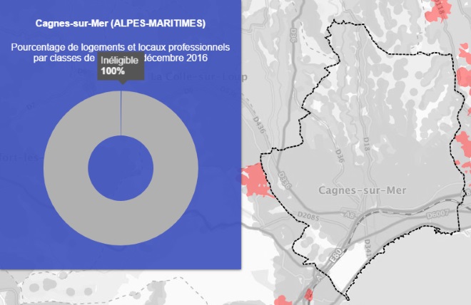 Grâce à la première carte on peut voir que la ville de Cagnes-sur-Mer est couverte à 19.6% par le très haut débit.