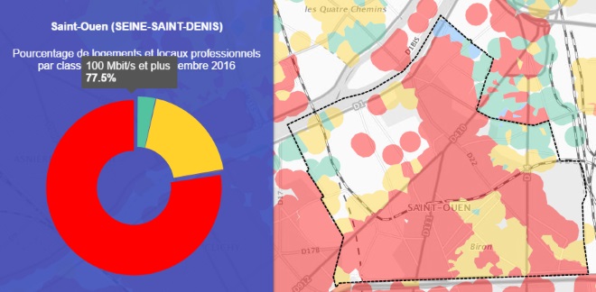 Grâce à la première carte on peut voir que la ville de Saint-Ouen est couverte à 77.5% par le très haut débit.