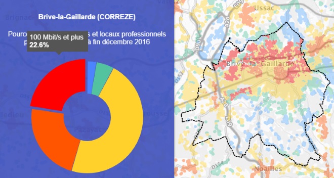 Grâce à la première carte on peut voir que la ville de Brive-la-Gaillarde est couverte à 22.6% par le très haut débit.