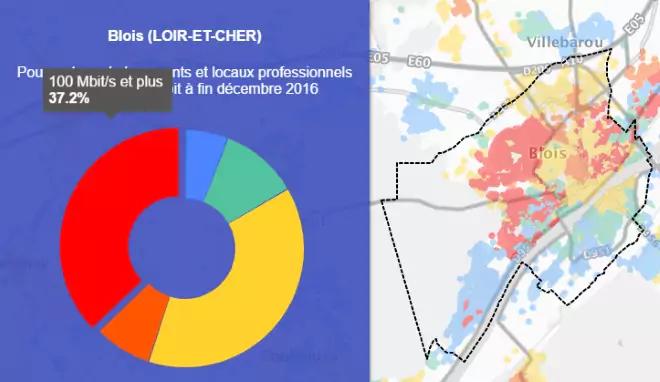 Grâce à la première carte on peut voir que la ville de Blois est couverte à 37.2% par le très haut débit.
