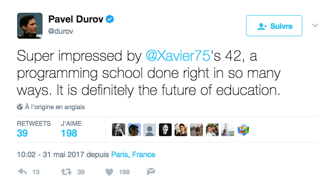 Créateur du plus grand réseau social européen Vkontakte et fondateur de l’application de messagerie Telegram malheureusement prisée des djihadistes, Pavel Durov est considéré comme le Zuckerberg russe et a préféré l’exil et une vie de nomade à Vladimir Poutine. Il a même proposé un emploi à Edward Snowden, l’analyste de la NSA réfugié en Russie en faisant virevolter l’équivalent de 4000 euros par sa fenêtre. Un esprit incorruptible de 32 ans dont l’Ecole 42 de Xavier Niel semble bel et bien lui avoir tapé dans l’oeil. En effet dans un post sur Twitter, l’intéressé s’est dit « super impressionné par 42 de Xavier Niel, une école de programmation bien faite, à bien des égards. C’est à coup sûr l’éducation de demain.» Aurait t-il visité en personne l’école et rencontré le magnat des télécoms ? Mystère.