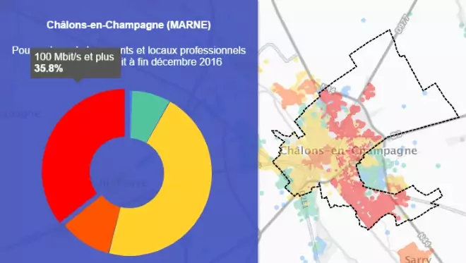 Grâce à la première carte on peut voir que la ville de Châlons-en-Champagne est couverte à 35.8% par le très haut débit.