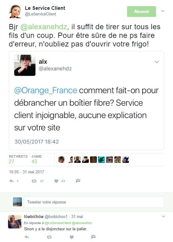 Besoin d’aide, de conseils ou d’informations ? l’équipe du (faux) Service Client est à votre disposition 24h/24 7j/7. Sur son compte twitter, les pépites se succèdent !
