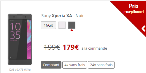 Cette fois-ci, c’est le Xperia XA qui est proposé au tarif de 179€ au lieu de 199€, soit 20€ de réduction. Cette remise est appliquée également lors d’un paiement en 4 fois sans frais : 47€ à la commande puis 44€/mois durant 3 mois. Idem sur le paiement en 24 fois : 35€ puis 6€ durant 24 mois. Cette offre est valable jusqu’au 22 juin
